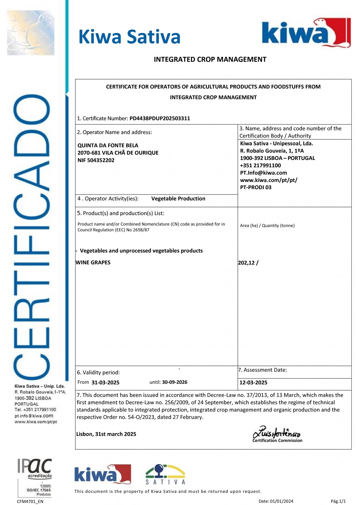 A Kiwa Sativa num processo transparente e independente, auditou a gestão sustentável da organização DFJ VINHOS, concedendo o direito de utilização de um selo, demonstrando assim o nosso compromisso com a produção sustentável de vinhos de qualidade.